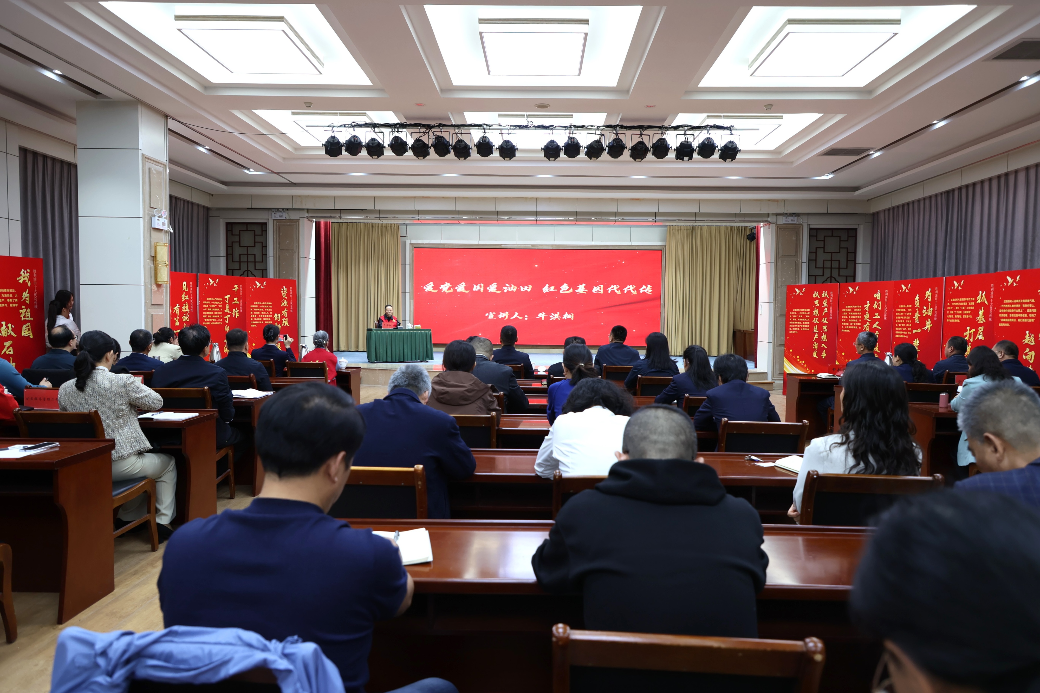 牛洪桐带来《爱党爱国爱油田 红色基因代代传》专题宣讲,带领大家回望胜利油田波澜壮阔的创业史诗:从华八井实现历史性勘探突破,到东营石油大会战热火朝天的攻坚场景,再到油田转型升级、蓬勃发展的奋进之路,生动再现老一辈石油人战天斗地、攻坚克难、无私奉献的热血瞬间。他结合鲜活案例深刻诠释铁人精神与胜利核心价值观的时代内涵,寄语青年员工牢记老一辈石油人的嘱托,扎根一线守初心、实干担当勇争先,接过奋斗接力棒,扛起时代新重任。