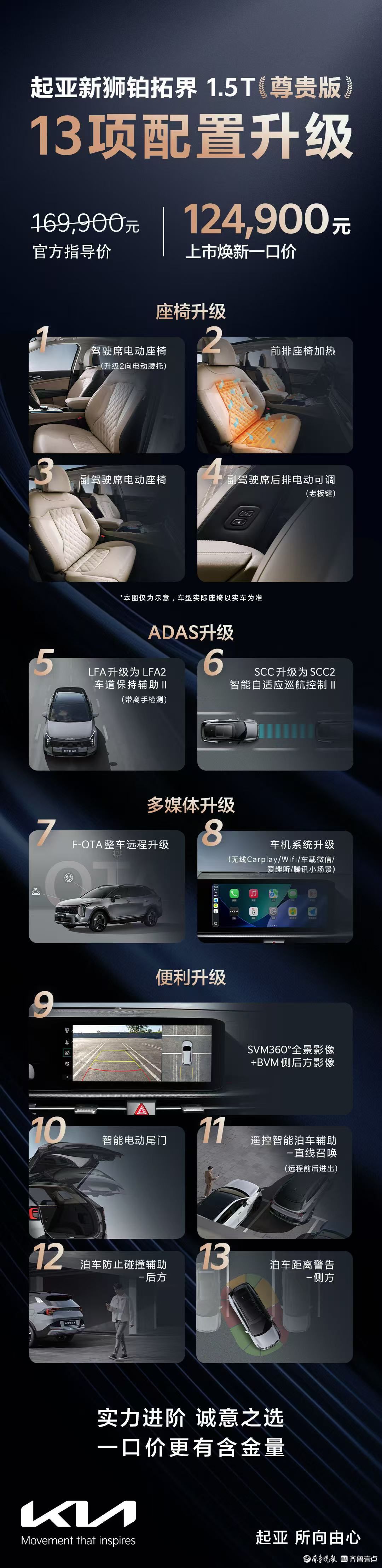 今年,全面焕新而来的起亚新狮铂拓界在坚守全球统一品质的基础上,深度结合中国家庭用户的出行需求,实现了美学设计、舒适配置、科技体验等多维度的全面突破。尤其是1.5T豪华版和1.5T尊贵版两款车型,更是在老款基础上,实现了增配不加价的升级,能分别满足不同用户对高性价比和高品质出行体验的需求。