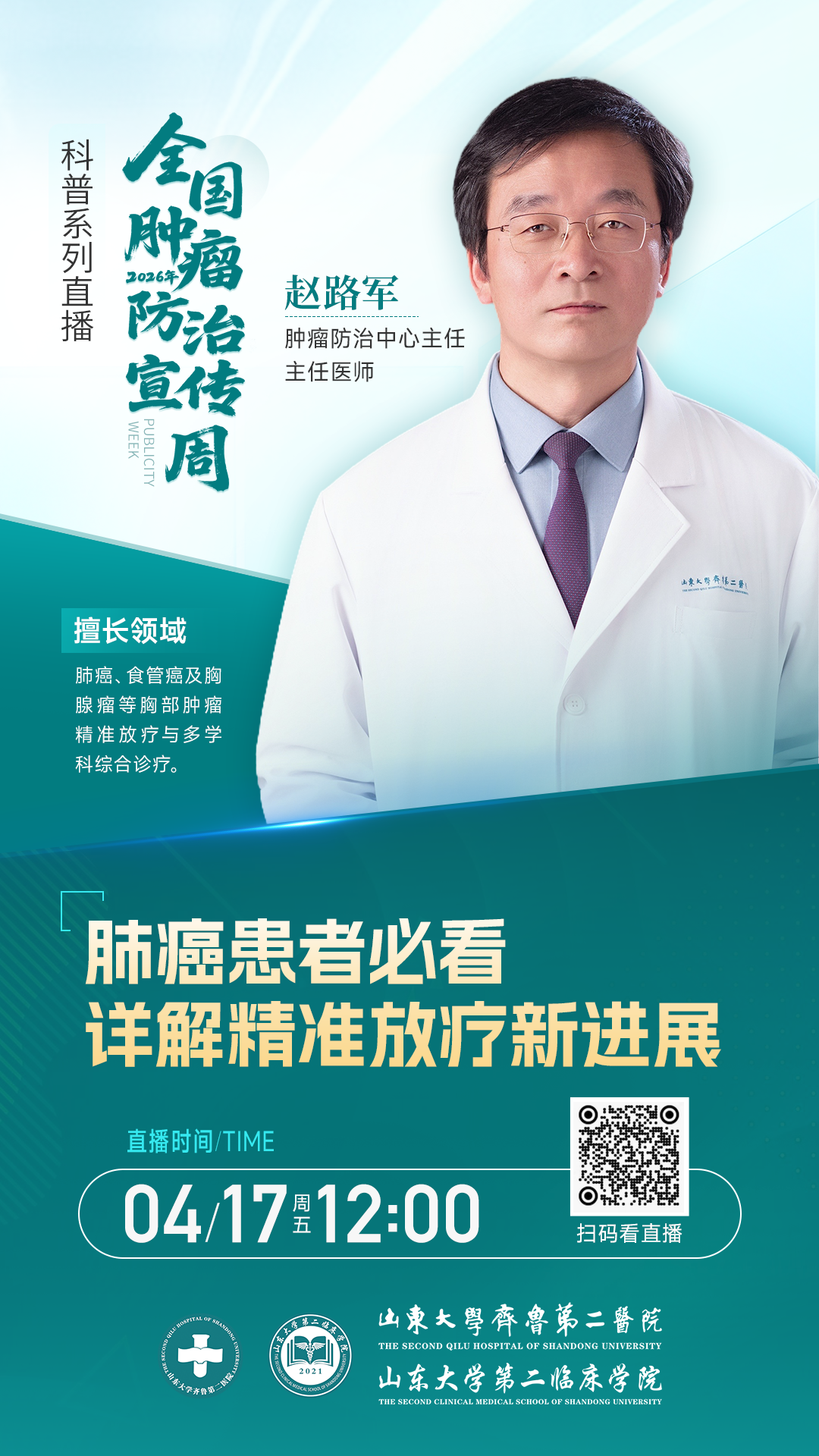 2026年全国肿瘤防治宣传周期间,肿瘤防治中心主任赵路军受邀做客新华网、人民网、中国网、山东电视台、大众网等各级主流媒体,围绕肿瘤发病趋势、日常预防等群众关心问题权威解读,形成中央+省级全域媒体联动声势;医院“大白·话”话健康直播间开设专场,4位权威肿瘤专家实时互动答疑,同步推送多平台,实现线上科普常态化、长效化。