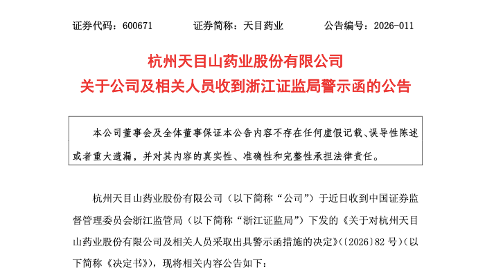 4月17日,天目药业(600671.SH)公告称,因信息披露不准确,公司及时任董事长刘加勇、总经理孙学建、董秘党国峻收到浙江证监局警示函和上交所监管警示。