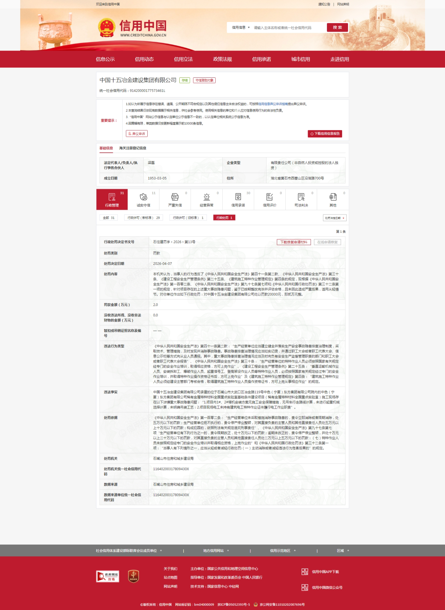 齐鲁晚报·齐鲁壹点记者于信用中国行政处罚栏获悉,4月7日,中国有色矿业集团旗下的中国十五冶金建设集团有限公司(下称“中国十五冶”)被行政处罚,案由为其施工现场存在两项涉嫌重大事故隐患问题,处罚机关是石嘴山市住房和城乡建设局。处罚决定书文号:石住建罚字﹝2026﹞第13号。