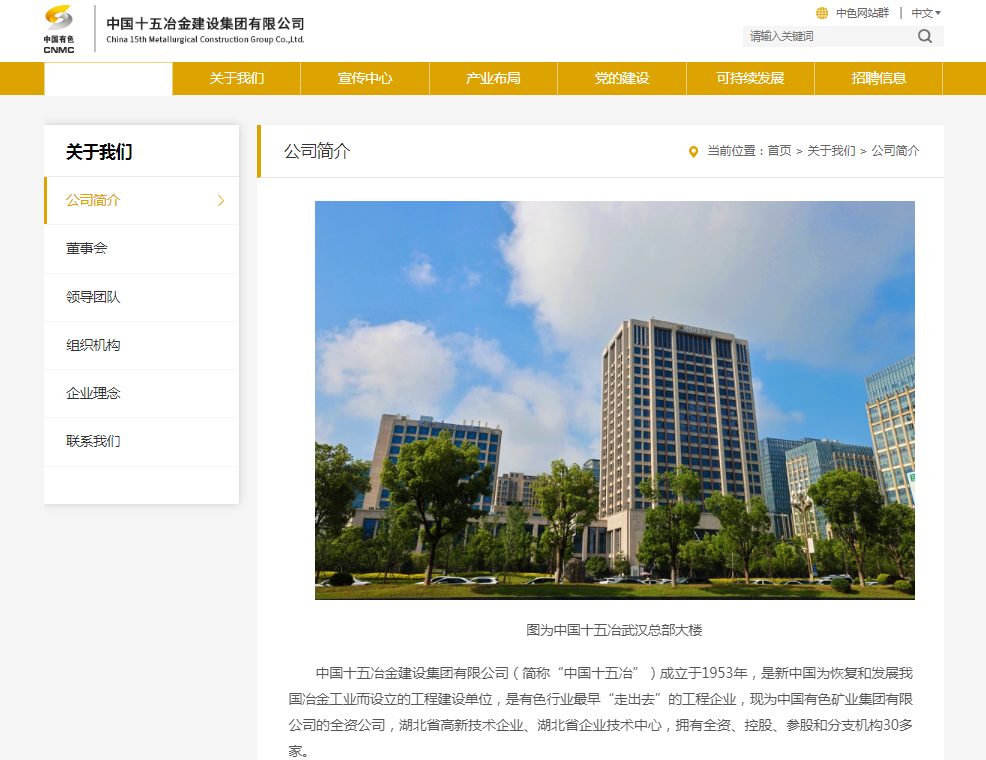 据中国十五冶官方网站介绍,公司现为中国有色矿业集团的全资公司,湖北省高新技术企业、湖北省企业技术中心,拥有全资、控股、参股和分支机构30多家。公司在矿山、冶炼领域具有传统优势,长期服务钢铁、石油、化工、能源、电力、建材、房建、市政、公路等领域,为国内外客户提供设计、咨询、投资、建设、采购、运营等优质服务。