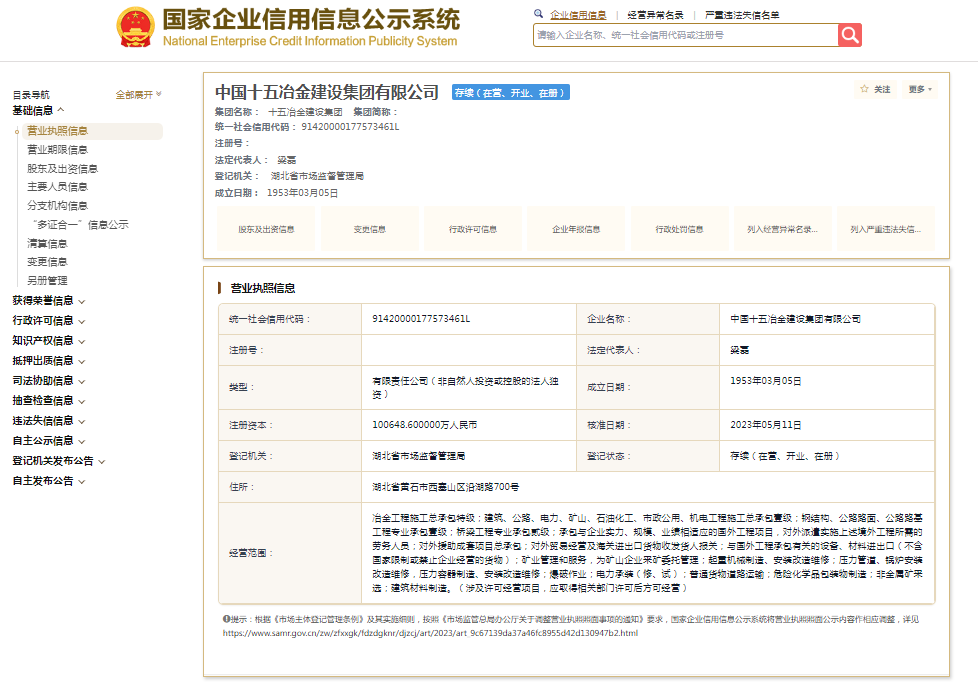 国家企业信用信息公示系统显示,中国十五冶金建设集团有限公司成立于1953年,注册资本100648.6万元人民币,法定代表人为梁磊,由中国有色矿业集团有限公司全资持股。