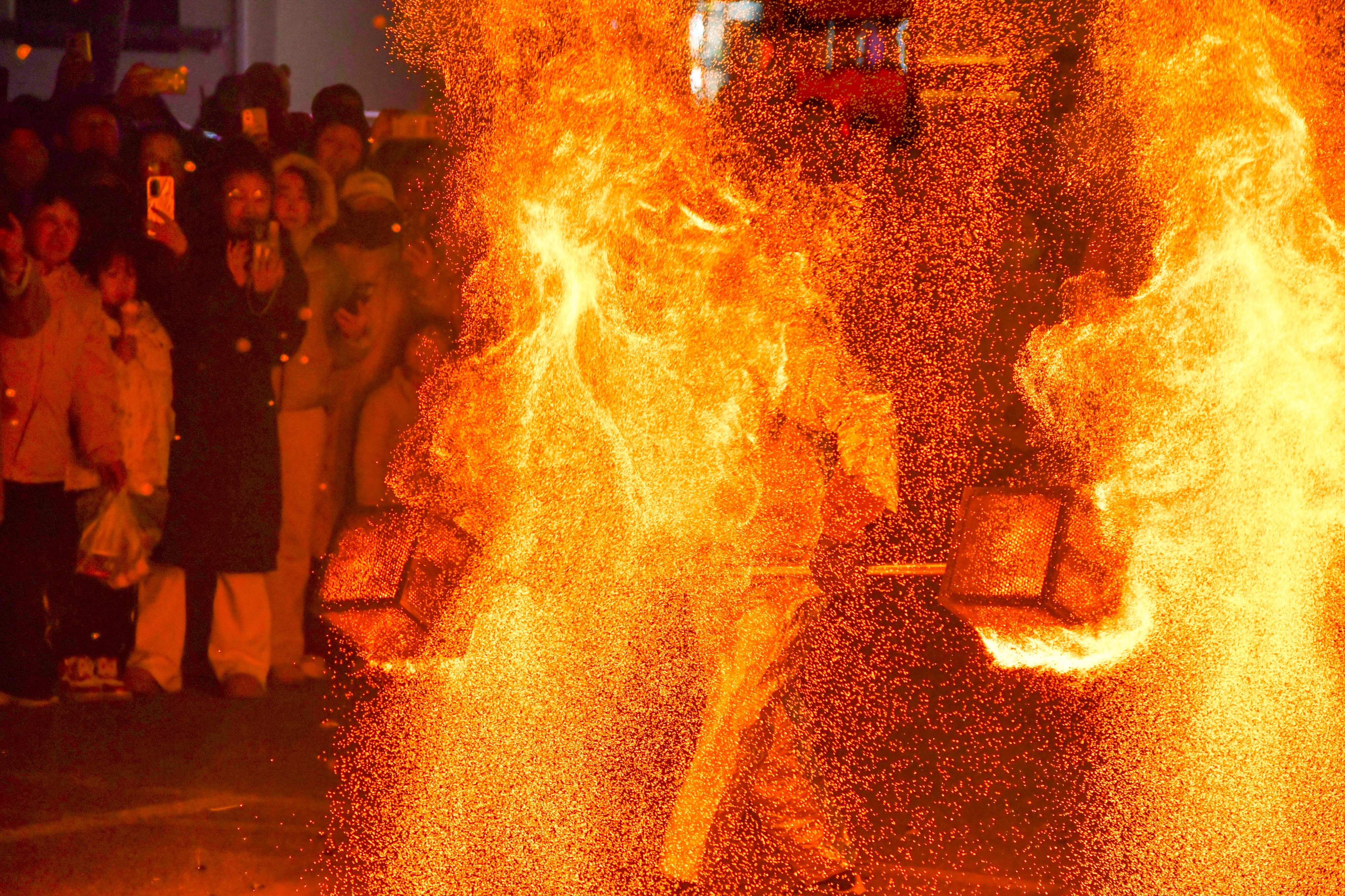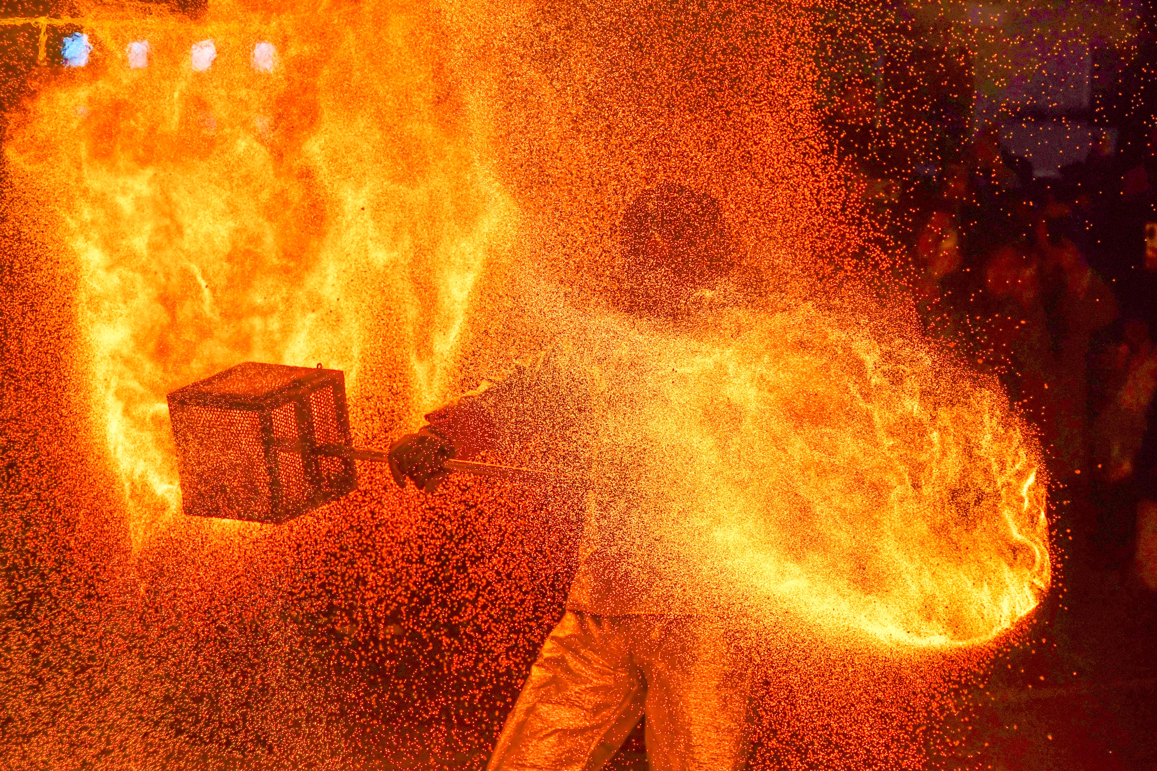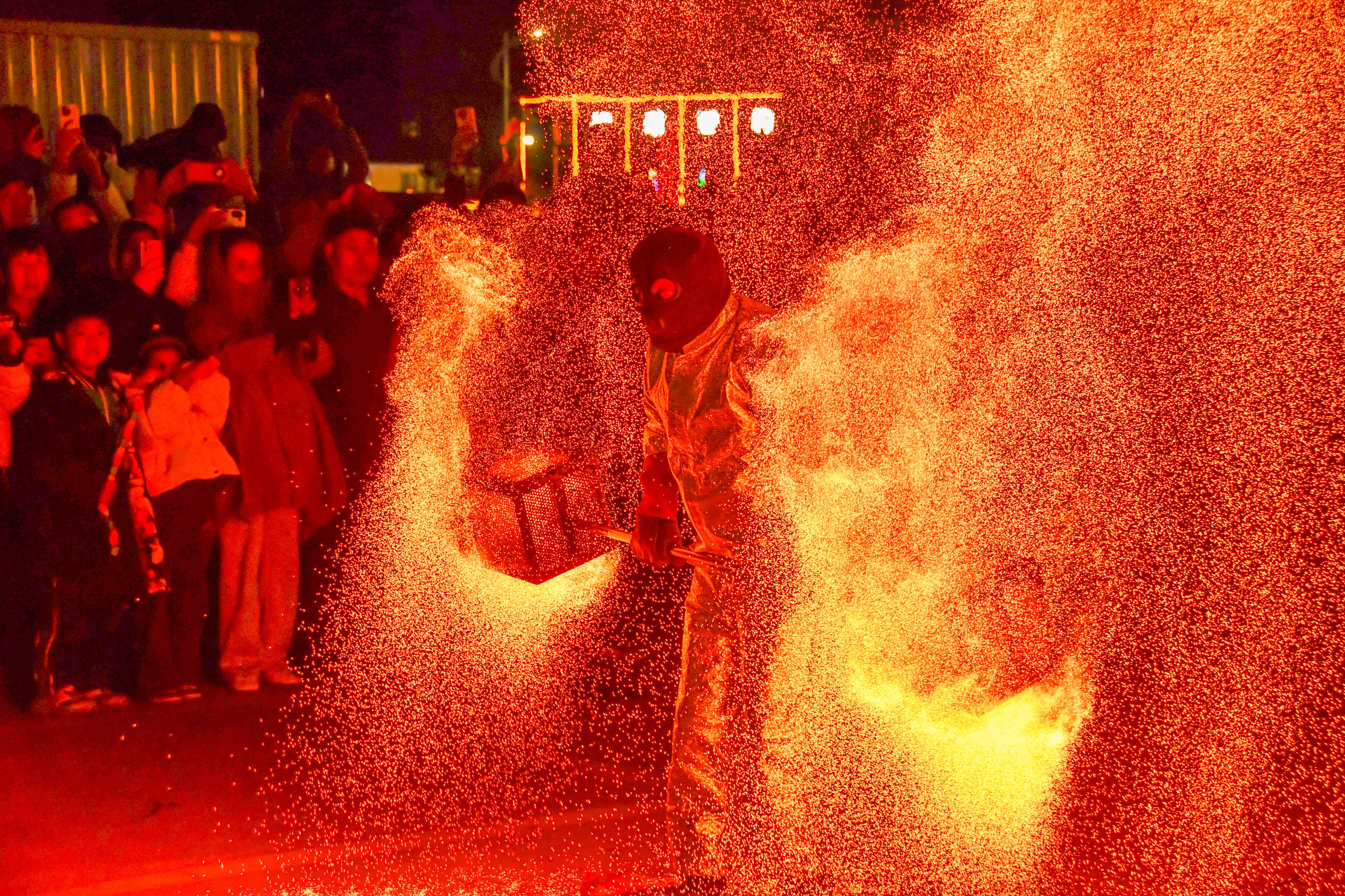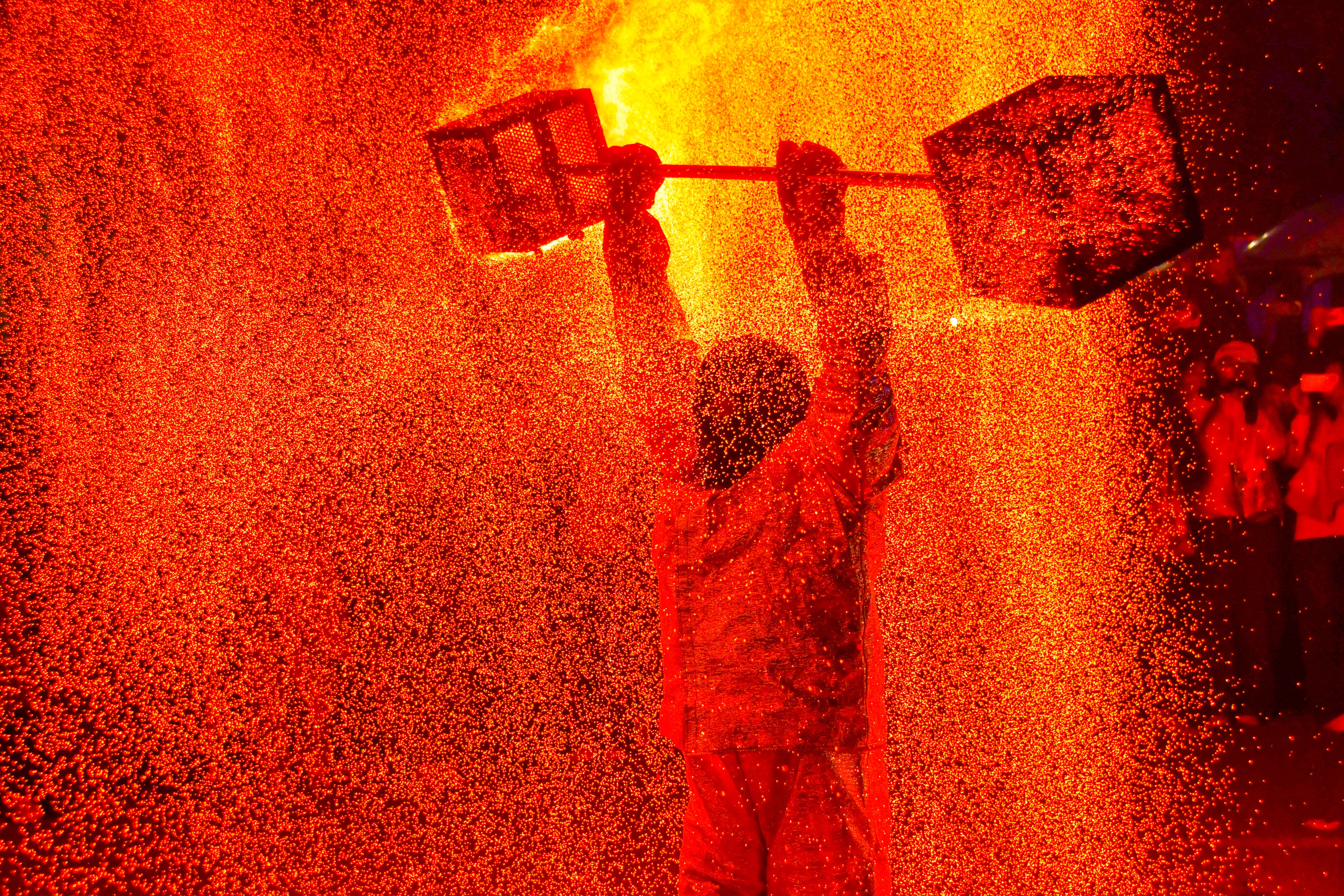 作品说明:作品中,表演者被火星“淹”了,还硬把工具举过头顶,像火焰里的勇士,瞬间抓牢表演的张力。色彩全是暖橙火调,火星子密得能“烫”屏幕,氛围感直接拉满。