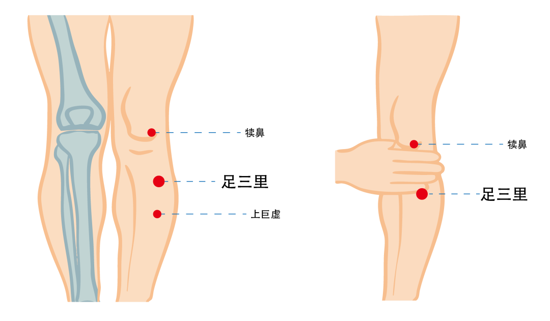 取穴定位:位于小腿前外侧,犊鼻(外膝眼)下3寸(4横指),胫骨前嵴外侧1横指处。左右腿各一穴。