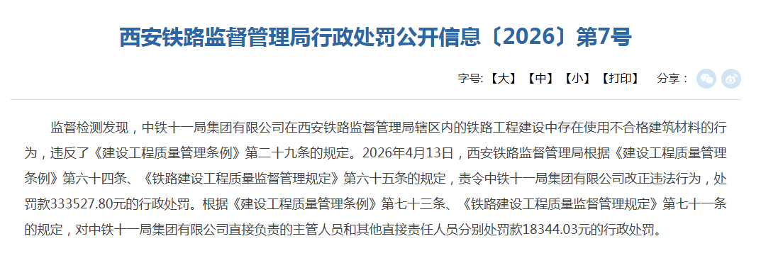 4月20日,国家铁路局官网公告称:西安铁路监督管理局发布〔2026〕第7号行政处罚信息,中铁十一局集团有限公司因在辖区内铁路工程建设中使用不合格建筑材料,被责令改正并处罚款33.35万元,相关责任人员也被处以罚款。
