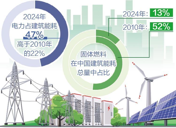 报告将研究重点聚焦建筑部门的能效变化。数据显示,目前建筑部门约占中国终端能源消费总量的20%。报告指出,中国已成为全球建筑电气化的领军者。建筑部门的电气化,特别是用热泵取代传统的煤炭供暖是能效提升的主要驱动力,也是能源系统“去碳化”的关键步骤。中国建筑部门的电气化率始终保持强劲增长。2024年,电力占建筑能耗的47%,远高于2010年的22%。同期,能效更高的天然气使用量也呈现持续增长趋势,增幅超过6%。固体燃料在中国建筑能耗总量中所占的比例从2010年的52%下降到2024年的13%。建筑用煤的大幅减少助推了中国的减排和污染治理工作。尽管建筑电气化提高了总电力需求,但电力普及和终端“去碳化”共同推动了中国绿色能源转型。