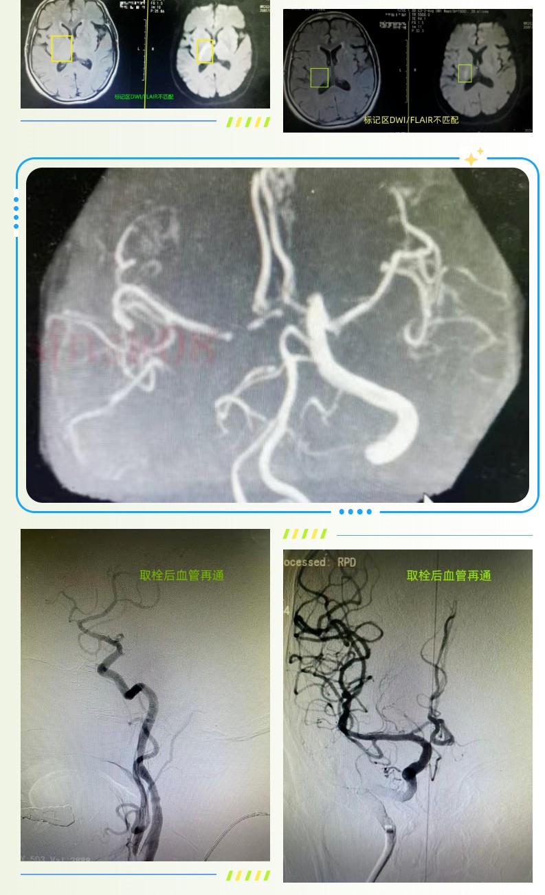 75岁的宋大娘因心慌、纳差、精神差入住泰安市第一人民医院心内科,老人既往有冠心病、充血性心力衰竭及心房颤动病史,长期口服利伐沙班进行抗凝治疗。入院当晚凌晨0时,宋大娘肢体活动一切正常,如厕后正常入睡,谁料次日晨7时醒来后,突发言语不清、左侧肢体活动障碍的症状。神经内三科医师接到会诊请求后第一时间赶往病房,结合症状快速判断为急性缺血性脑卒中(醒后卒中),为患者进行NIHSS评分达12分,情况十分危急。神经内科介入团队迅速响应,神经介入科主任王伟、神经内三科副主任张松第一时间确定诊疗方案,当即启动脑卒中绿色通道,快速联系核磁共振室,为患者紧急行颅脑MRI+MRA 检查。检查结果提示患者 DWI/FLAIR 不匹配,存在缺血半暗带,颅脑MRA 显示右侧颈内动脉闭塞,这意味着患者脑部仍有可挽救的脑组织,为后续精准救治提供了关键依据。