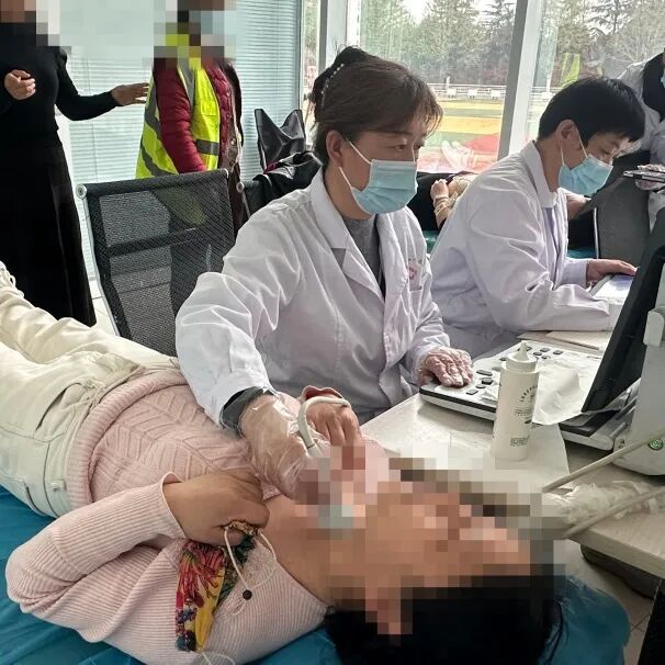 为了让职工们在不耽误工作的情况下更多地了解自身状况,医院将“体检科”搬到了现场。医护人员耐心细致地为每一位职工测量血压、血糖,并现场进行心电图、乳腺及甲状腺彩超等检查。