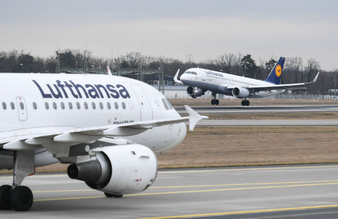 2022年1月17日,两架汉莎航空公司的飞机抵达德国法兰克福机场。新华社记者逯阳摄