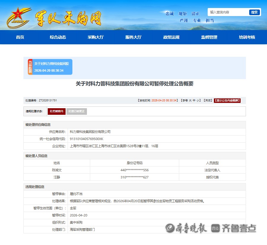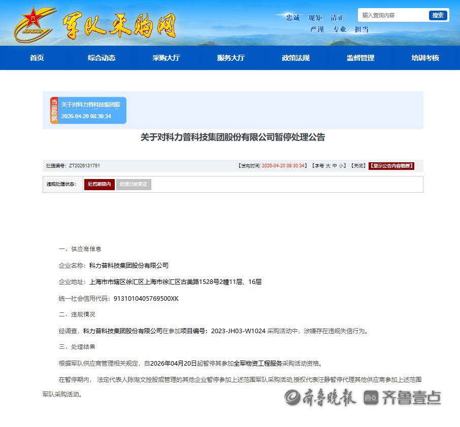 4月20日,军队采购网发布关于对科力普科技集团股份有限公司(下称“科力普集团”)暂停处理公告。