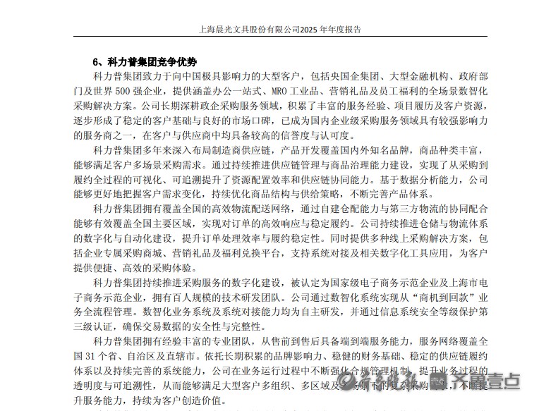 科力普集团是晨光股份(603899.SH)旗下公司,致力于为央企集团、金融、政府、世界 500 强及国企民企500 强等各类客户提供高性价比的一站式采购服务。科力普集团拥有丰富的产品线,业务场景覆盖办公一站式、MRO工业品、营销礼品和员工福利,包含办公用纸、办公文具、办公耗材、办公设备、电脑及配件、数码及通讯、办公电器、生活用品、商务礼品、食品饮料、办公家具、劳防用品、工业品等超过百万种商品。