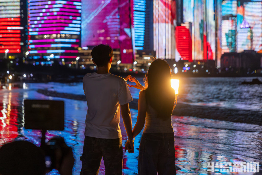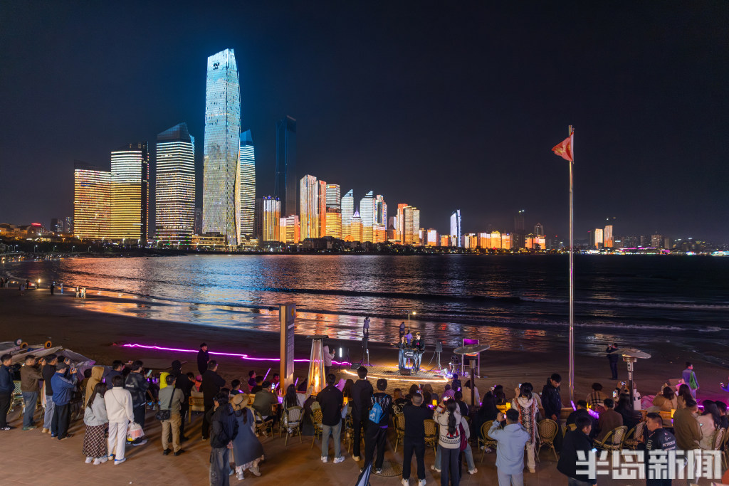 4月19日晚,青岛第三海水浴场上很是热闹,许多游客于夜色中来到这里,观看浮山湾灯光秀、欣赏沙滩音乐演出,拍下浪漫的照片。