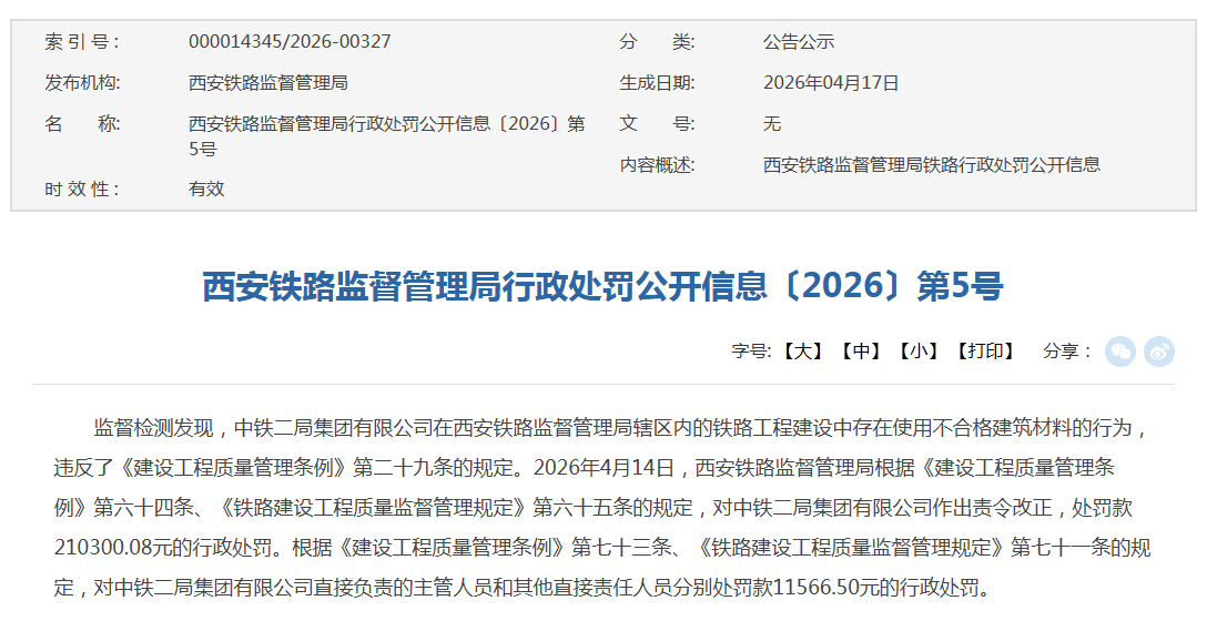 4月17日,国家铁路局西安铁路监督管理局发布〔2026〕第5号行政处罚公开信息,中铁二局集团有限公司因在辖区内铁路工程建设中使用不合格建筑材料,被依法作出行政处罚。