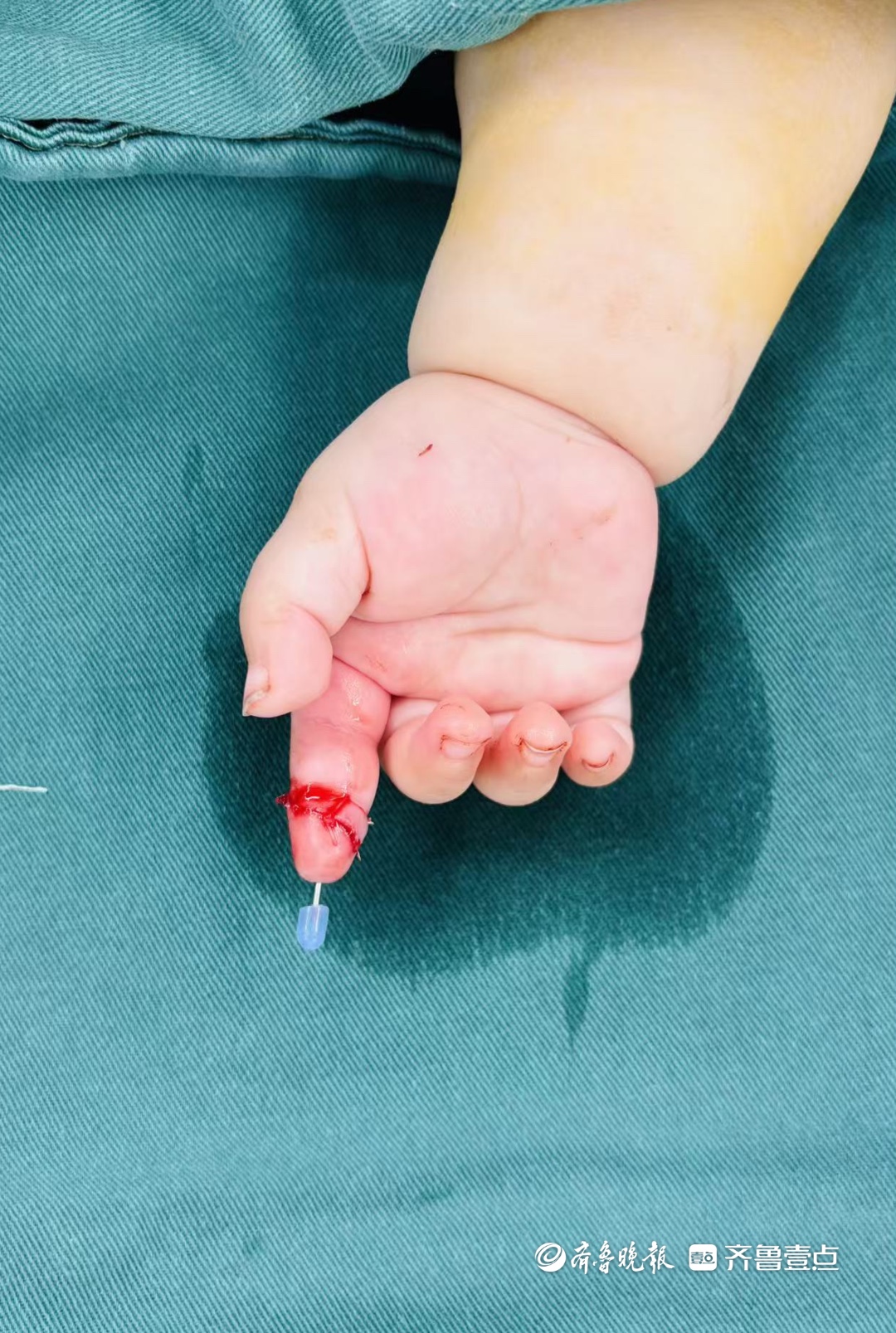 4月15日下午,济南市第三人民医院手及上肢外科病房内,7个月大的芙芙(化名)正好奇地打量着周遭,她的右手缠着厚厚的无菌纱布。11天前,这个刚萌出两颗乳牙的女婴,经历了一场断指再植的极限救援——她的右手食指第一关节被剪刀完全剪断……