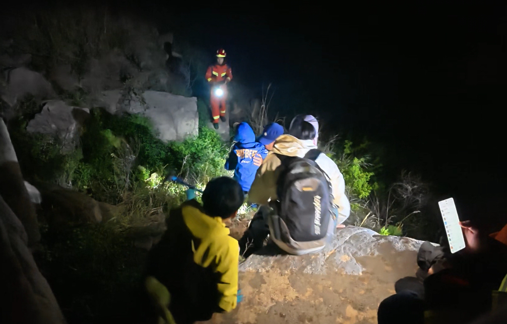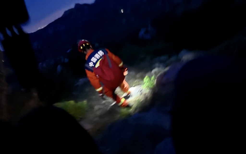 17时42分,救援队伍抵达现场,随即联合景区工作人员乘坐皮卡车,沿景区防火道赶往被困人员附近区域。经现场勘查,母子三人被困于孤立山头,进退无路,且周边山势陡峭、地形复杂。据景区工作人员介绍,抵达被困点需绕行三座山头,现场无安全攀爬条件。此时夜幕降临,山区气温骤降,加之被困人员中有两名年幼儿童,救援刻不容缓。救援人员迅速部署方案,留一名队员就地照明、指引方向,其余队员携带救援绳索、强光照明等装备,在景区工作人员引导下徒步进山搜救,上山搜救期间救援人员多次摔倒。