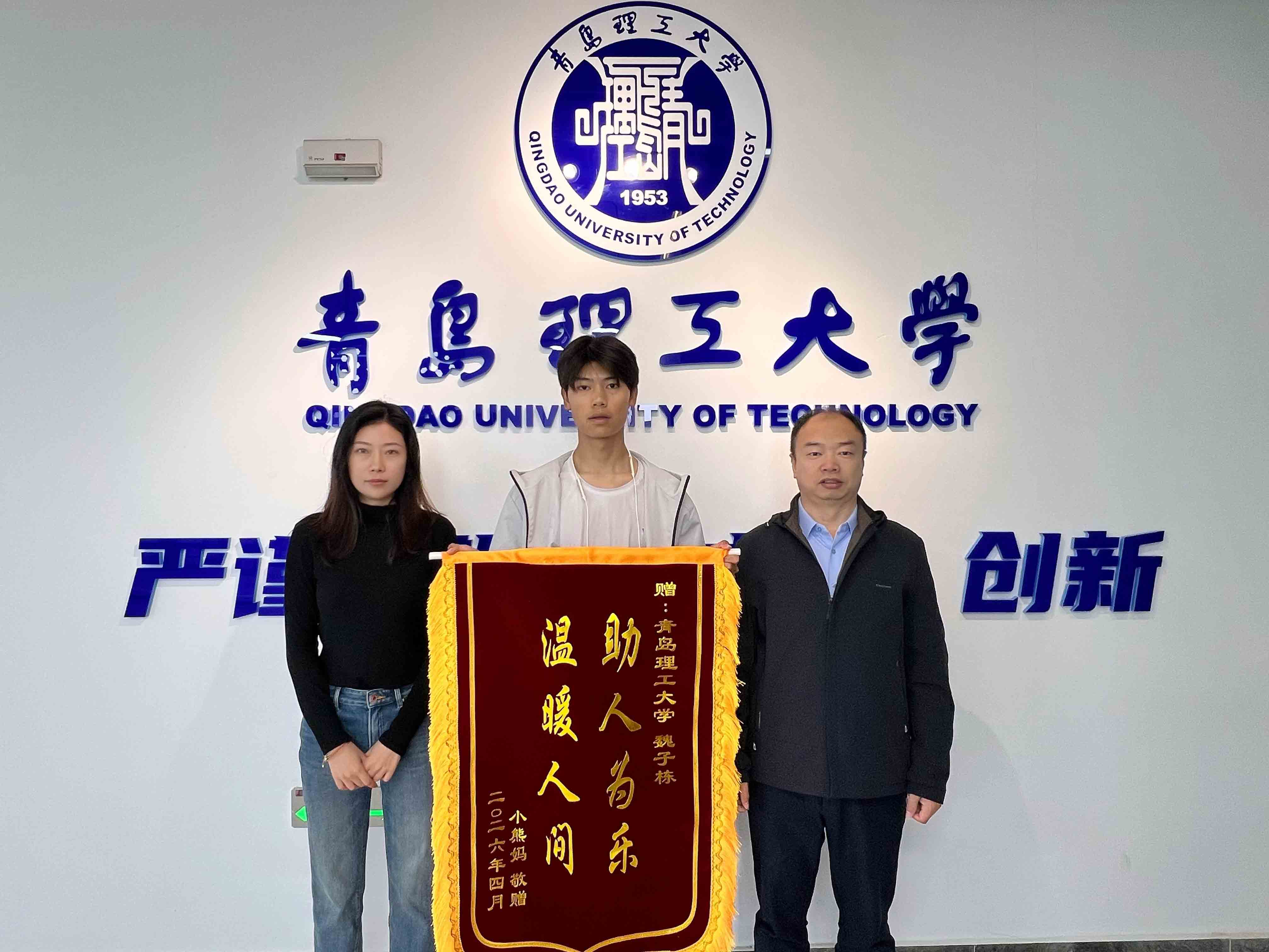 4月16日,一面写着“助人为乐 温暖人间”的锦旗被送到青岛理工大学信息管理学院,“感谢学校培养了这么热心的学生,让我的孩子得到及时救治!”送锦旗的是受伤孩童的母亲王女士,她辗转联系到学院,对集成251班魏子栋同学雨中护航受伤孩子就医的暖心举动表示由衷地感谢。