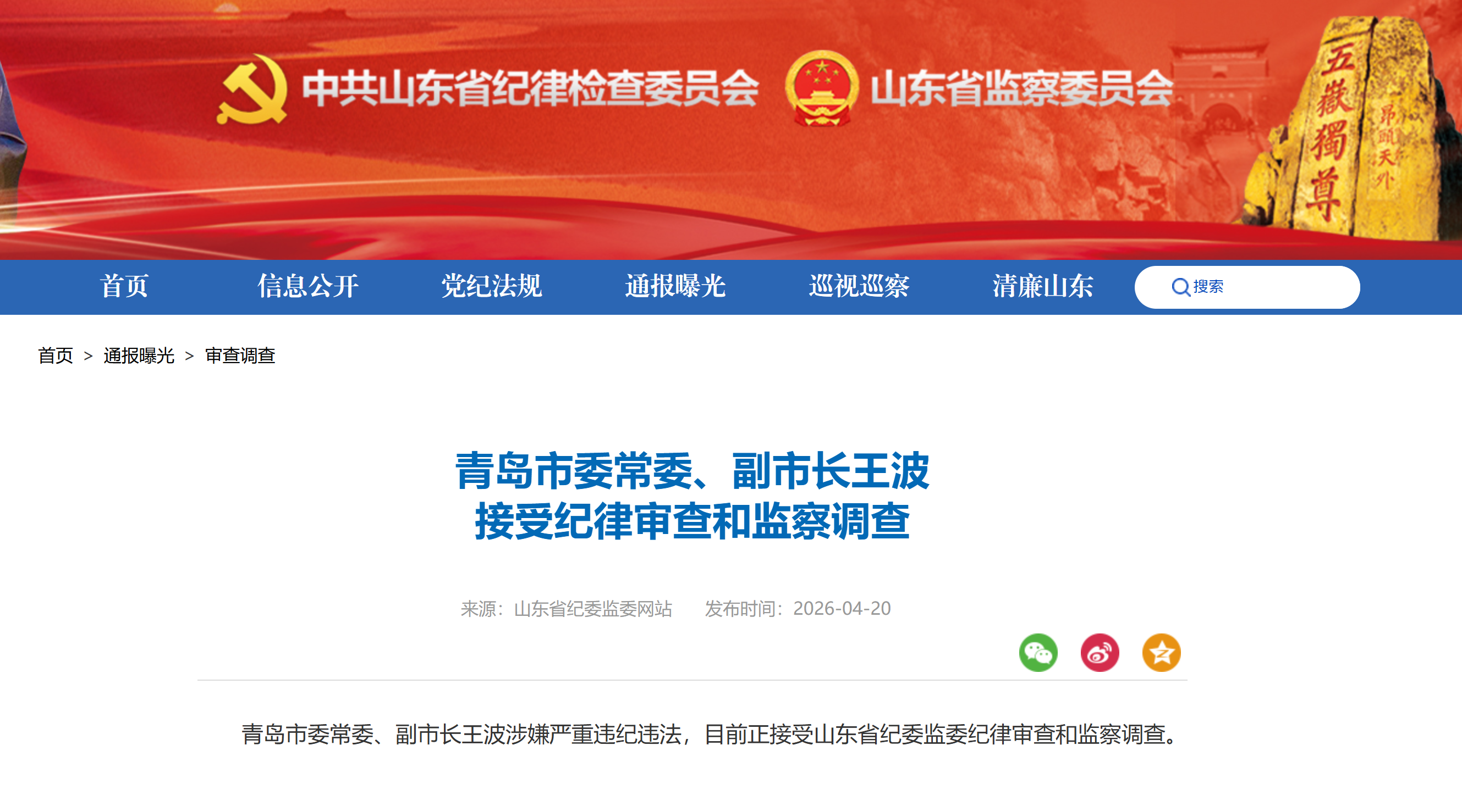 山东省纪委监委网站4月20日消息,青岛市委常委、副市长王波涉嫌严重违纪违法,目前正接受山东省纪委监委纪律审查和监察调查。