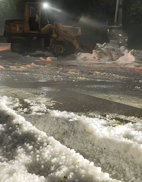 4月19日,据多名网友发布视频,贵州省六盘水市钟山区金盆乡突降冰雹,现场有铲车在清理路面上的冰雹。