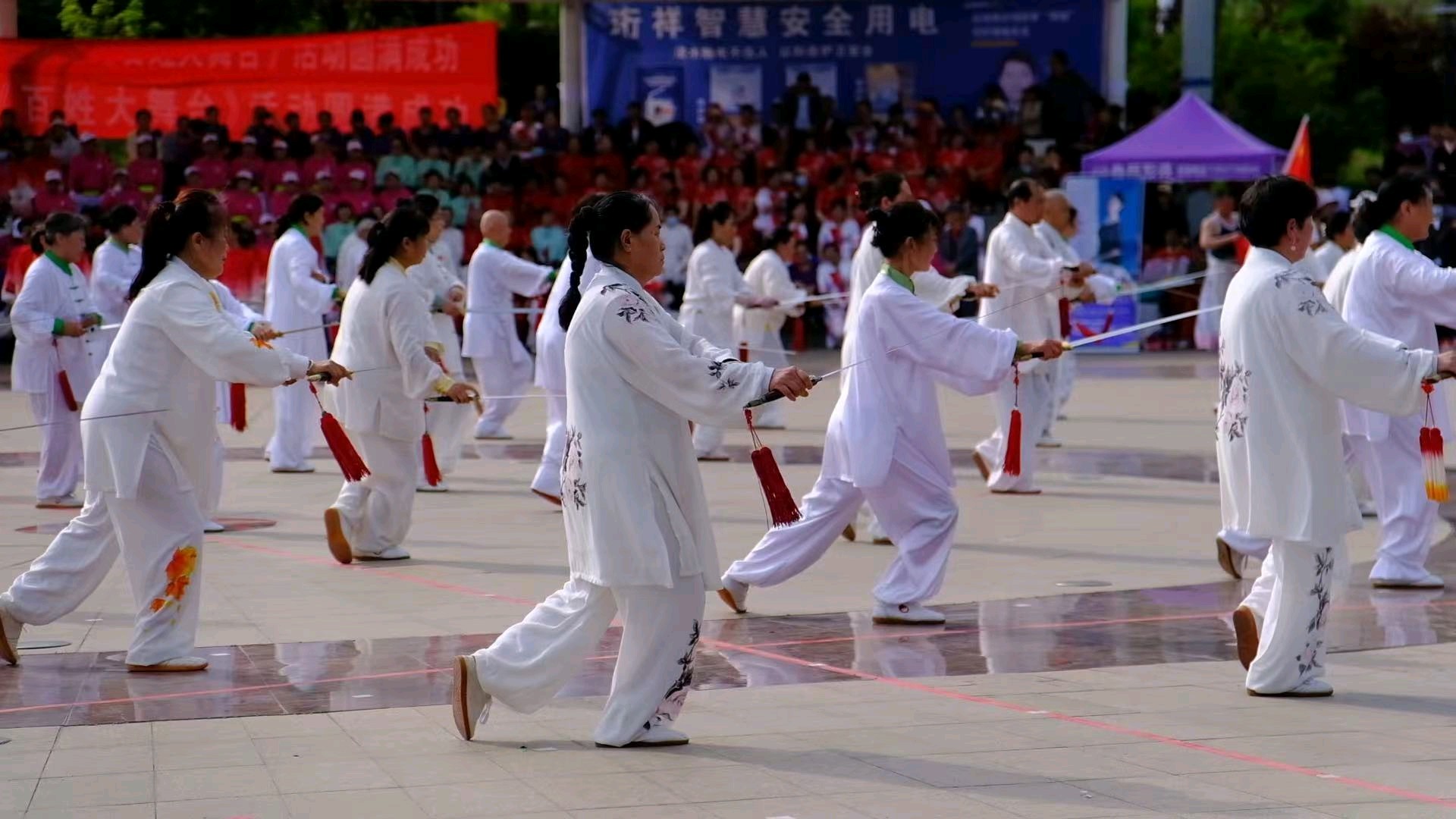 午后二时,暖场表演率先登场,为整场活动营造出热烈欢腾的氛围。交响乐团奏响《迎宾进行曲》《团结友谊进行曲》《运动员进行曲》,激昂的旋律瞬间点燃现场热情。紧接着,鼓乐《赛马》节奏铿锵、龙舞《中国龙》气势磅礴,鼓声震天、龙腾盛世,赢得观众阵阵喝彩。热身经络拍打操,动作舒缓实用,吸引不少观众现场跟学。欢庆腰鼓《东方红》红火喜庆,鼓点清脆、红绸飞扬,洋溢着浓郁的节日气息。随后,充满青春活力的街舞《快乐动起来》、童声独唱《花非花》以及旅居海外的枣庄七旬夫妇特意录制的《鼓浪屿之波》相继亮相,传统与现代交织,银发与童颜相映,为暖场环节画上了多彩的句号。