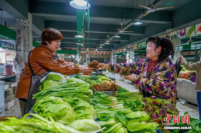 4月14日,湖北省宜昌市一菜市场内,市民正在购买香椿。 陈涛 摄香椿亦是暮春的时令珍味。此时鄂西山地、江汉平原,房前屋后、田埂林间,香椿树的嫩芽散发着独特的馥郁香气。