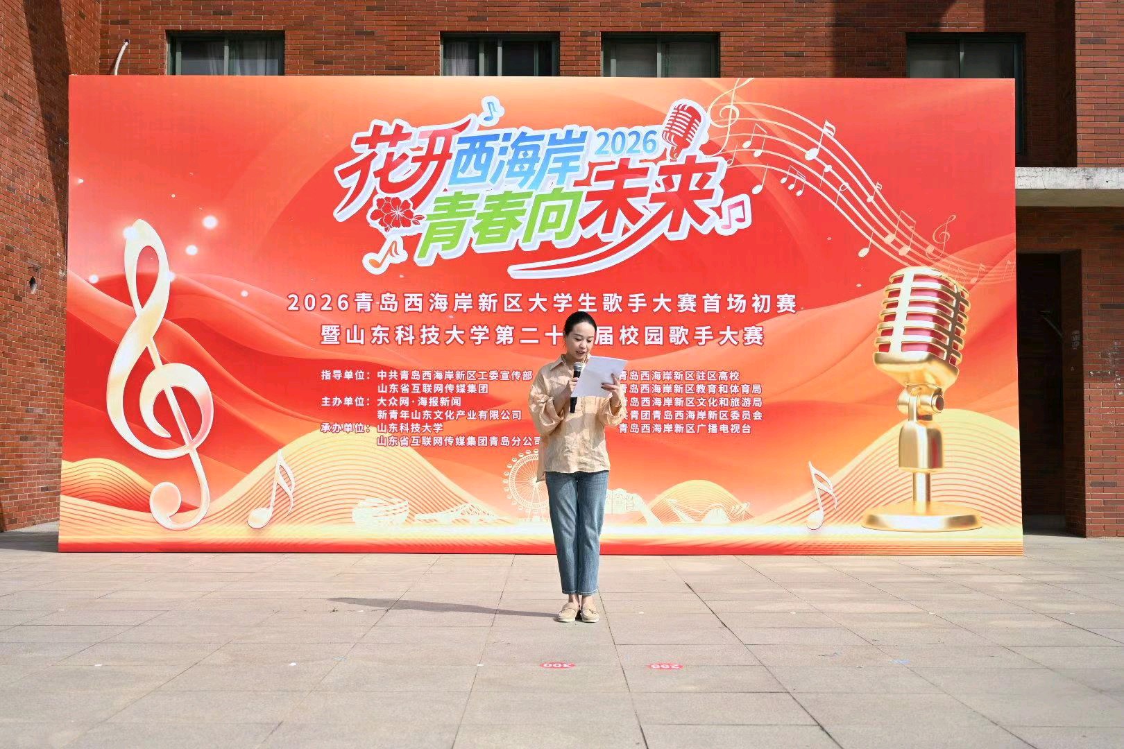 春和景明,歌声飞扬;青春逐梦,不负韶华。4月18日,“花开西海岸·青春向未来”2026青岛西海岸新区大学生歌手大赛首场初赛暨山东科技大学第二十一届校园歌手大赛在山东科技大学繁星广场燃情开唱。现场,来自该校的近200名学子同台竞技,以清澈嗓音传递青春力量,用一首首耳熟能详的歌曲点燃了春日校园的热情,也奏响了属于新区的青春乐章。