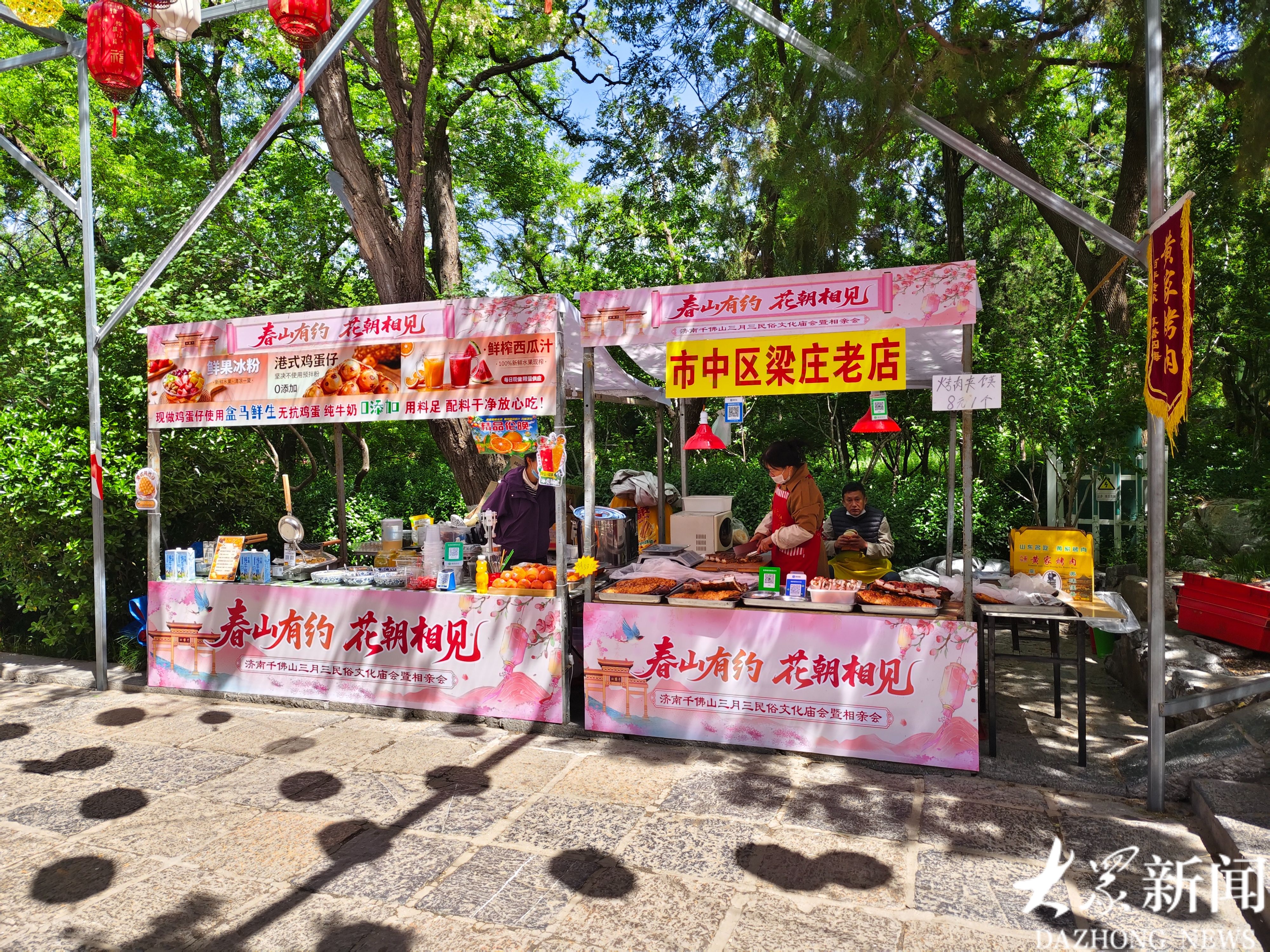从北门牌坊至卧佛段,近百个摊位沿山路两侧一字排开,吆喝声、欢笑声此起彼伏。刚出炉的周村烧饼薄脆喷香,油亮的黄家烤肉滋滋作响,清甜的泉水茶汤顺喉解腻,更有吹糖人、糖画等非遗手作现场展演,特产百货、林果山货琳琅满目。一场色香味形俱佳的春日盛宴呈现在广大市民游客面前。每逢三月三,吃一口烧饼,逛一圈山货,便是济南人最祈盼的热闹。
