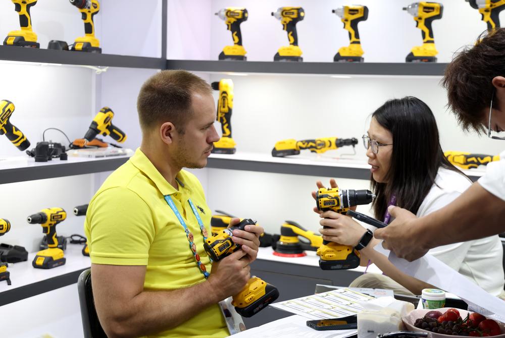 19일 '제139회 중국수출입박람회(캔톤페어)'에서 한 바이어가 전기드릴을 살펴보고 있다.