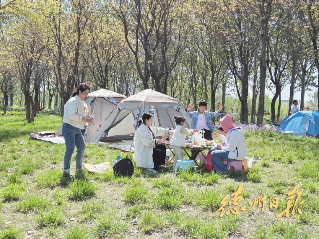 4月12日上午9点,德城区锦绣川景区岔河东岸,不少市民已带着帐篷、桌椅、野餐垫等露营装备前来“安营扎寨”。“得早来占位置,这片林下空地晒不着,离着停车点也近,拿取东西方便。”市民周茹说,一家四口每年春天都会抽空来露营,无需费心费力规划远途行程,家门口就能轻松享受自然野趣。