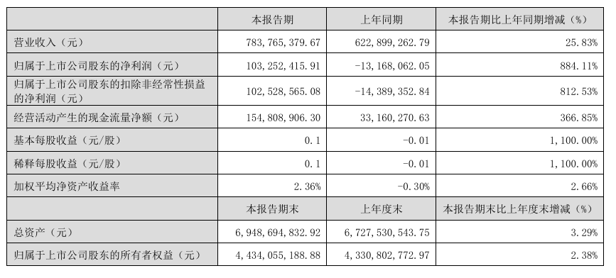 财报显示,一季度,益生股份实现营业总收入7.84亿元,同比增长25.83%;归属于上市公司股东的净利润为1.03亿元,而上年同期则为净亏损1316.81万元,同比大幅增长884.11%;扣除非经常性损益后的净利润同样达到1.03亿元,同比增长812.53%。报告期内,公司基本每股收益为0.10元,同比增长1100%,加权平均净资产收益率为2.36%,经营活动产生的现金流量净额为1.55亿元,同比大幅增长366.85%,公司主营业务盈利能力和现金流状况的显著改善。