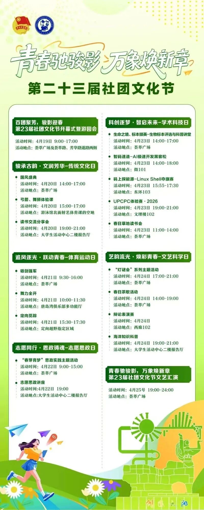 各大社团齐聚,多元文化交融,快来解锁社团新玩法,来一场与石大的奇妙邂逅,具体安排如下: