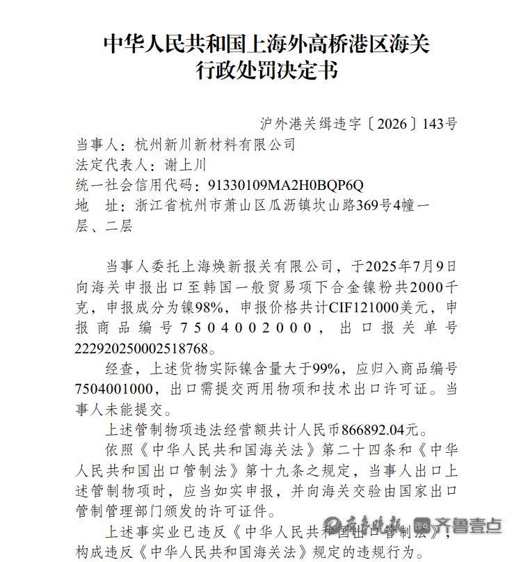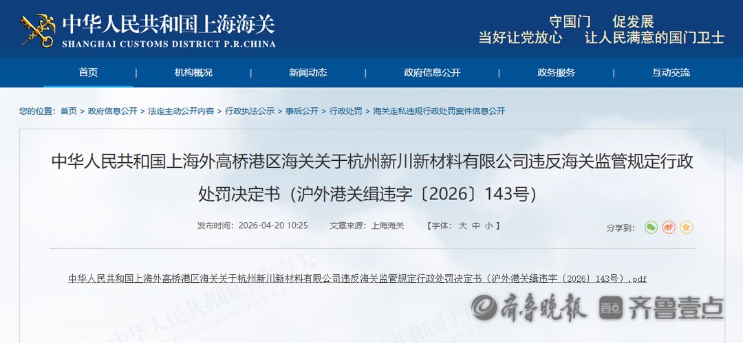 4月20日,中华人民共和国上海外高桥港区海关发布关于杭州新川新材料有限公司(下称“新川新材”)违反海关监管规定行政处罚决定书(沪外港关缉违字〔2026〕143号)。