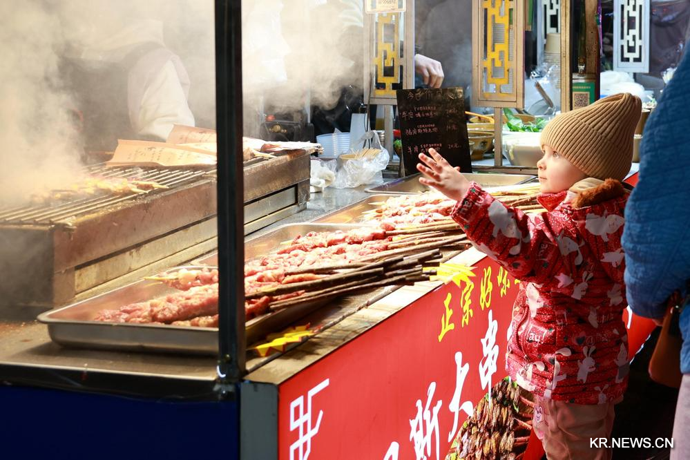 [신화망 중국 하얼빈 4월18일]16일 헤이룽장(黑龍江)성 헤이허(黑河)·아이후이(愛輝) 국제대야시장에서 한 어린이가 부모님과 함께 먹거리를 구매하고 있다.
