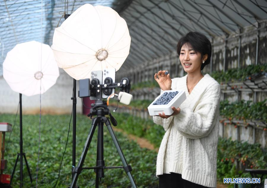 베이징시 핑구(平谷)구 위쯔산(魚子山)촌의 한 시설농업기지 비닐하우스에서 라이브방송으로 블루베리를 판매하고 있는 직원. (사진/신화통신)