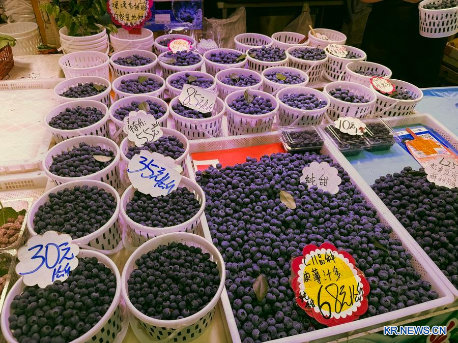 지난 11일 윈난(雲南)성 쿤밍(昆明)시의 다관좐(大觀篆) 신농산물시장에 진열된 블루베리. (사진/신화통신)