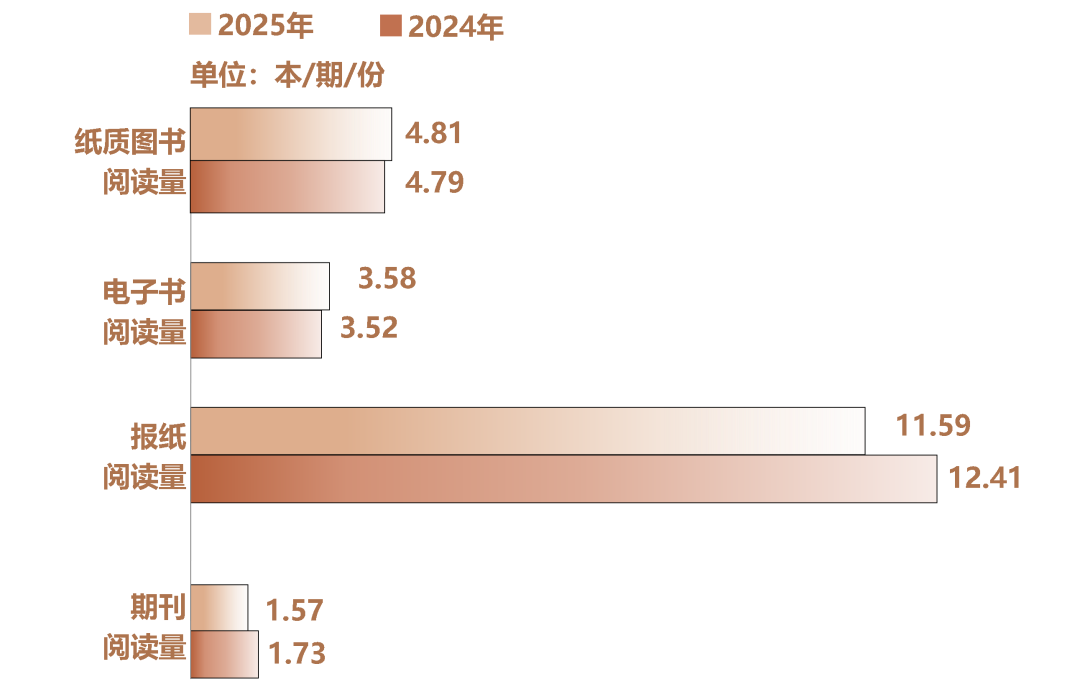 更值得关注的是阅读量的增长。2025年成年国民人均纸质书阅读量4.81本,电子书3.58本,合计8.39本,比2024年有所提升。