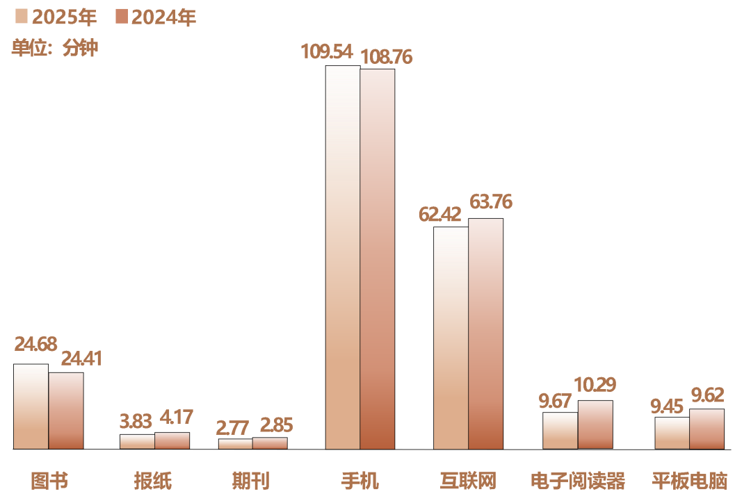 调查数据显示,2025年成年国民的手机阅读率高达79.0%,人均每天手机接触时长109.54分钟,较上年增加0.78分钟;而人均每天阅读纸质图书的时间,只有24.68分钟,仅为手机接触时长的零头。电子阅读器、Pad、电脑端的阅读率均出现下降,唯独手机阅读和听书、视频讲书的比例在上升。