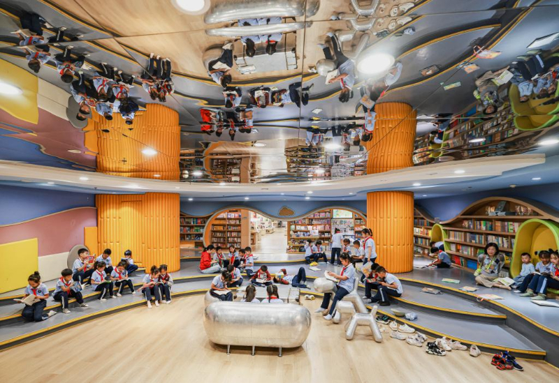 2025年5月29日,孩子们在山东省荣成市新世纪城市书房阅读。新华社发(李信君摄)