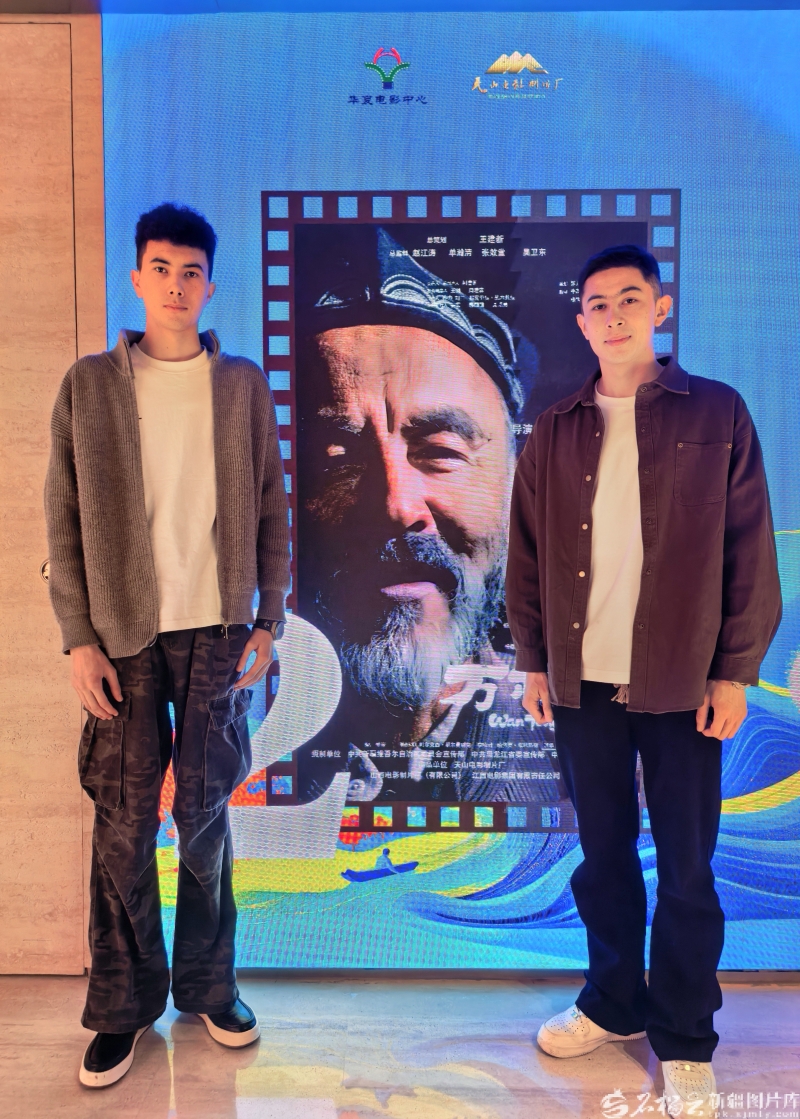 吐尔迪•阿洪的玄孙阿布都乃比江•阿不力米提(右)和阿布都乃扎尔•阿不力米提在电影海报前 石榴云/新疆日报记者 银璐摄