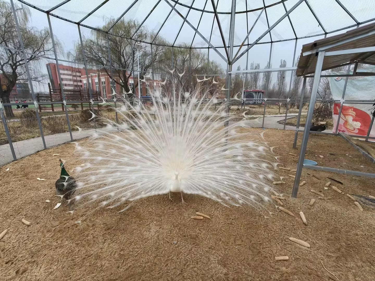 校园农场里,最让我惊艳的,莫过于那只白孔雀。它站在铁丝网围成的园子里,像一位身披雪色华服的王子,在春风里缓缓展开了尾羽。