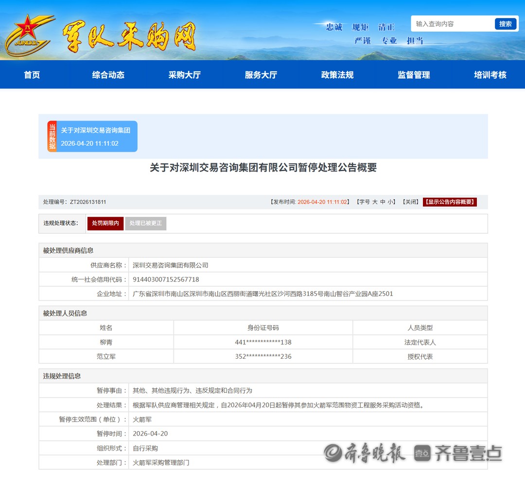 根据火箭军采购管理部门公布的《关于对深圳交易咨询集团有限公司暂停处理公告》显示,经调查,深圳交易咨询集团有限公司在参加项目编号:2022-JJDJBA-W4002(2)、项目编号:2022-JJDJBA-W4002(3)、项目编号:2022-JJDJBA-W4002(1)采购活动中,涉嫌存在违规失信行为。根据军队供应商管理相关规定,自2026年04月20日起暂停其参加火箭军范围物资工程服务采购活动资格。