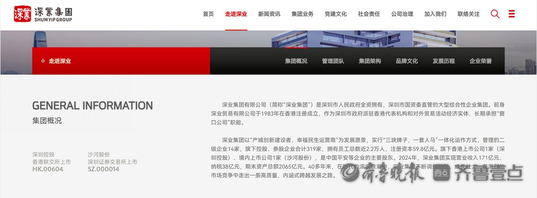 深业集团官网显示,深业集团有限公司(简称“深业集团”)是深圳市人民政府全资拥有,深圳市国资委直管的大型综合性企业集团。前身深业贸易有限公司于1983年在香港注册成立,作为深圳市政府派驻香港代表机构和对外贸易活动经济实体,长期承担“窗口公司”职能。深业集团管理的二级企业14家,旗下控股、参股企业合计319家,拥有员工总数近2.2万人,注册资本59.8亿元。旗下香港上市公司1家(深圳控股 00604.HK)、境内上市公司1家(沙河股份 000014),是中国平安等企业的主要股东。