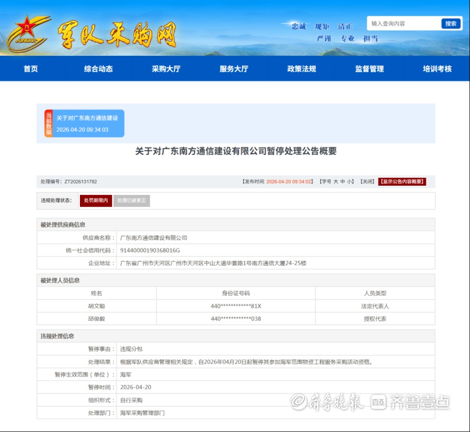 据《关于对广东南方通信建设有限公司暂停处理公告》显示,经调查,广东南方通信建设有限公司在参加项目编号:2022-JHNICT-G1001采购活动中,涉嫌存在违规分包行为。根据军队供应商管理相关规定,自2026年04月20日起暂停其参加海军范围物资工程服务采购活动资格。在暂停期内,法定代表人胡文聪控股或管理的其他企业暂停参加上述范围军队采购活动,授权代表邱俊毅暂停代理其他供应商参加上述范围军队采购活动。
