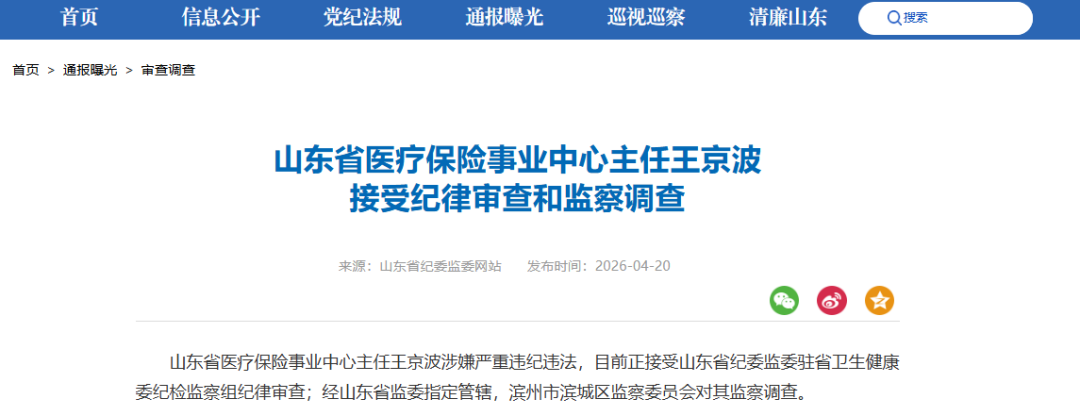 4月20日,据山东省纪委监委网站消息:山东省医疗保险事业中心主任王京波涉嫌严重违纪违法,目前正接受山东省纪委监委驻省卫生健康委纪检监察组纪律审查;经山东省监委指定管辖,滨州市滨城区监察委员会对其监察调查。