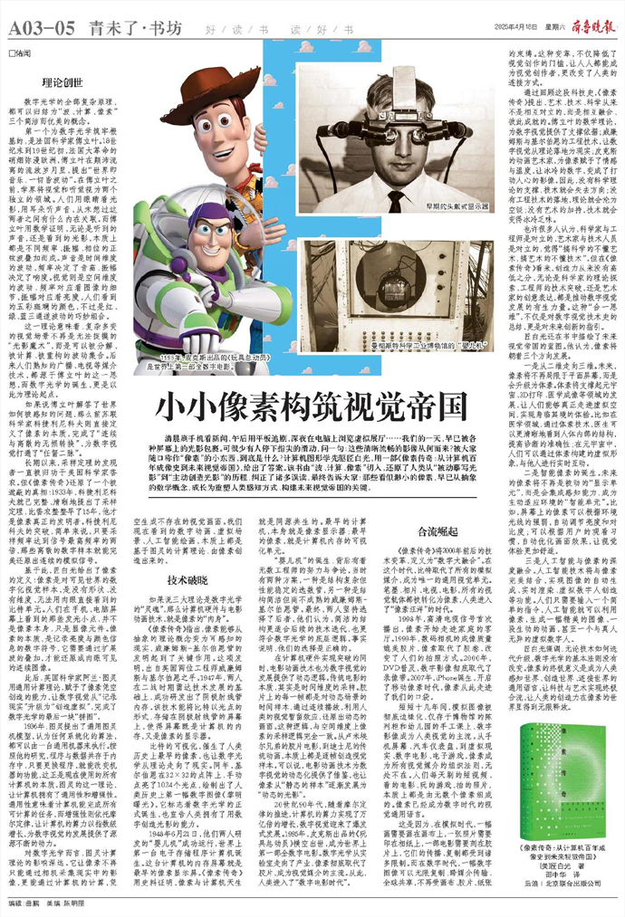 清晨刷手机看新闻,午后用平板追剧,深夜在电脑上浏览虚拟展厅……我们的一天,早已被各种屏幕上的光影包裹。可很少有人停下指尖的滑动,问一句:这些清晰流畅的影像从何而来?被大家随口称作“像素”的小东西,到底是什么?计算机图形学先驱匠白光,用一部《像素传奇:从计算机百年成像史到未来视觉帝国》,给出了答案。该书由“波、计算、像素”切入,还原了人类从“被动摹写光影”到“主动创造光影”的历程,纠正了诸多误读,最终告诉大家:那些看似渺小的像素,早已从抽象的数学概念,成长为重塑人类感知方式、构建未来视觉帝国的关键。