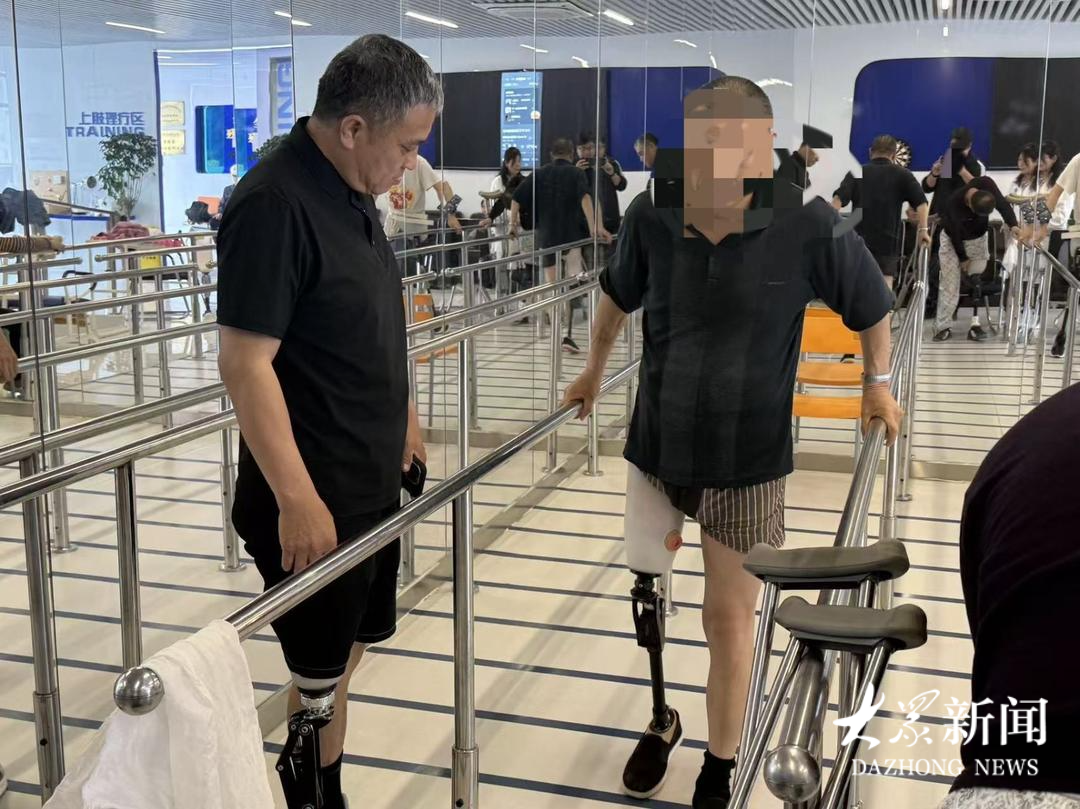 孙祥礼(左)帮助安装假肢的人进行恢复行走训练。