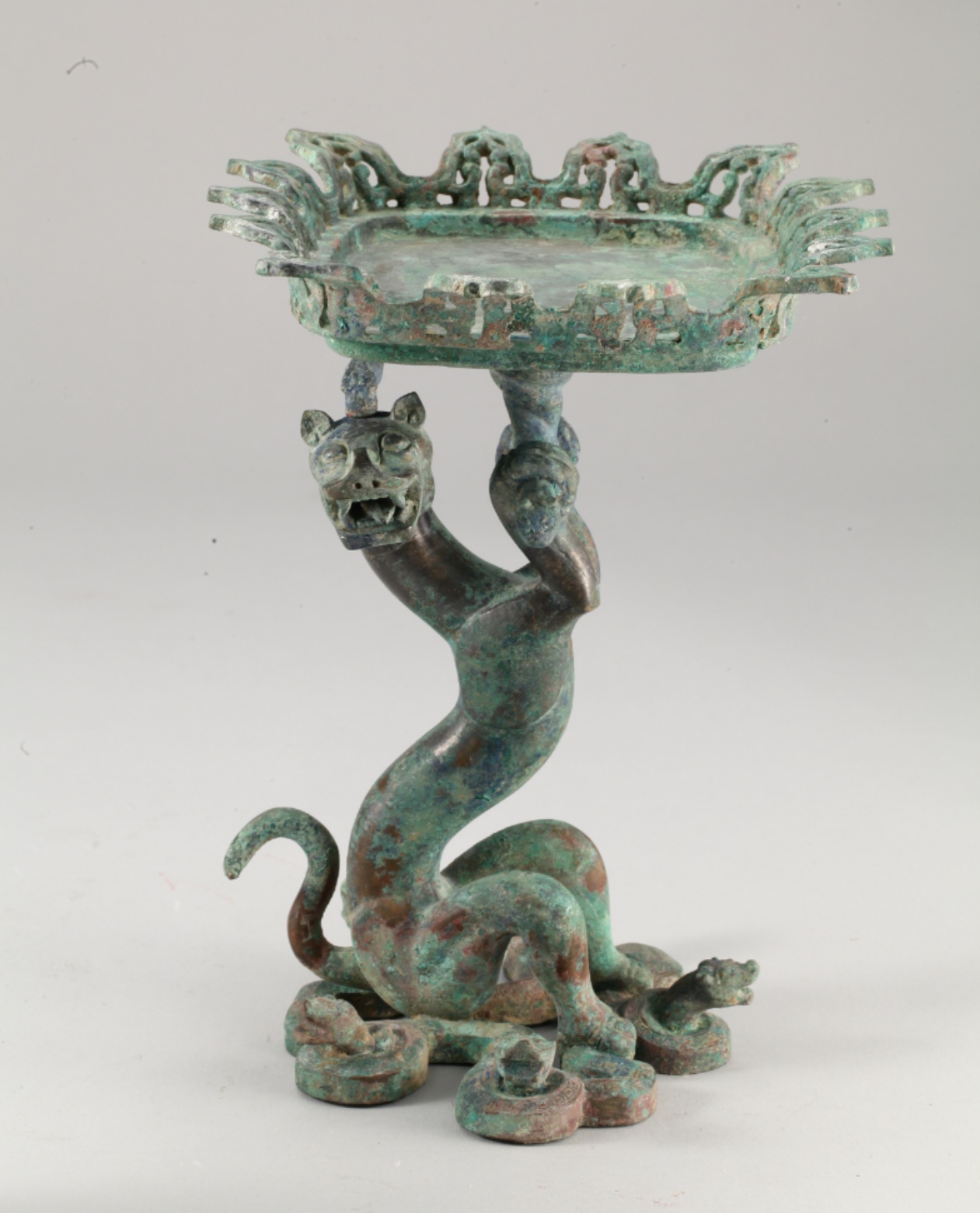 兽形柄青铜方豆,战国时期,出土于山东临淄,具有鲜明的楚地文化特征,是齐楚文化交流的见证。