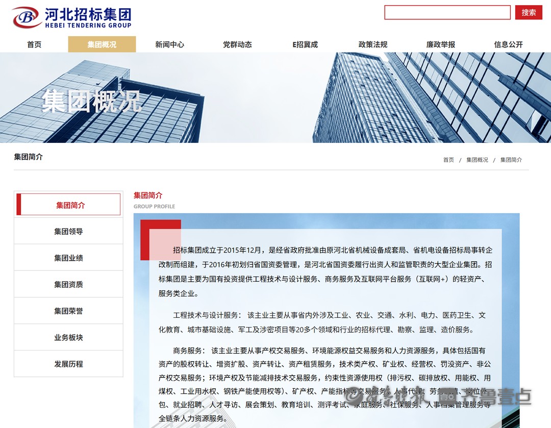 河北招标集团有限公司官网显示,招标集团成立于2015年12月,是经省政府批准由原河北省机械设备成套局、省机电设备招标局事转企改制而组建,于2016年初划归省国资委管理,是河北省国资委履行出资人和监管职责的大型企业集团。招标集团是主要为国有投资提供工程技术与设计服务、商务服务及互联网平台服务(互联网+)的轻资产、服务类企业。
