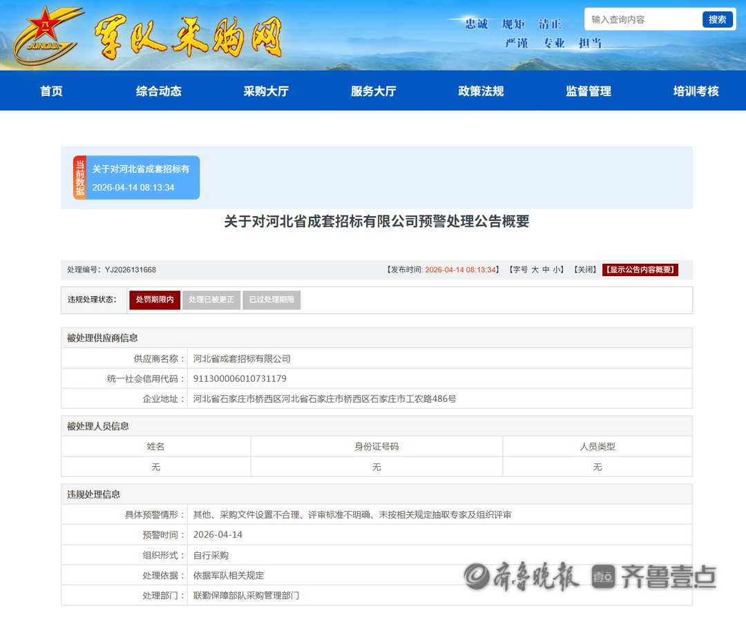 涉嫌存在违规行为,河北省成套招标有限公司被军采书面警告