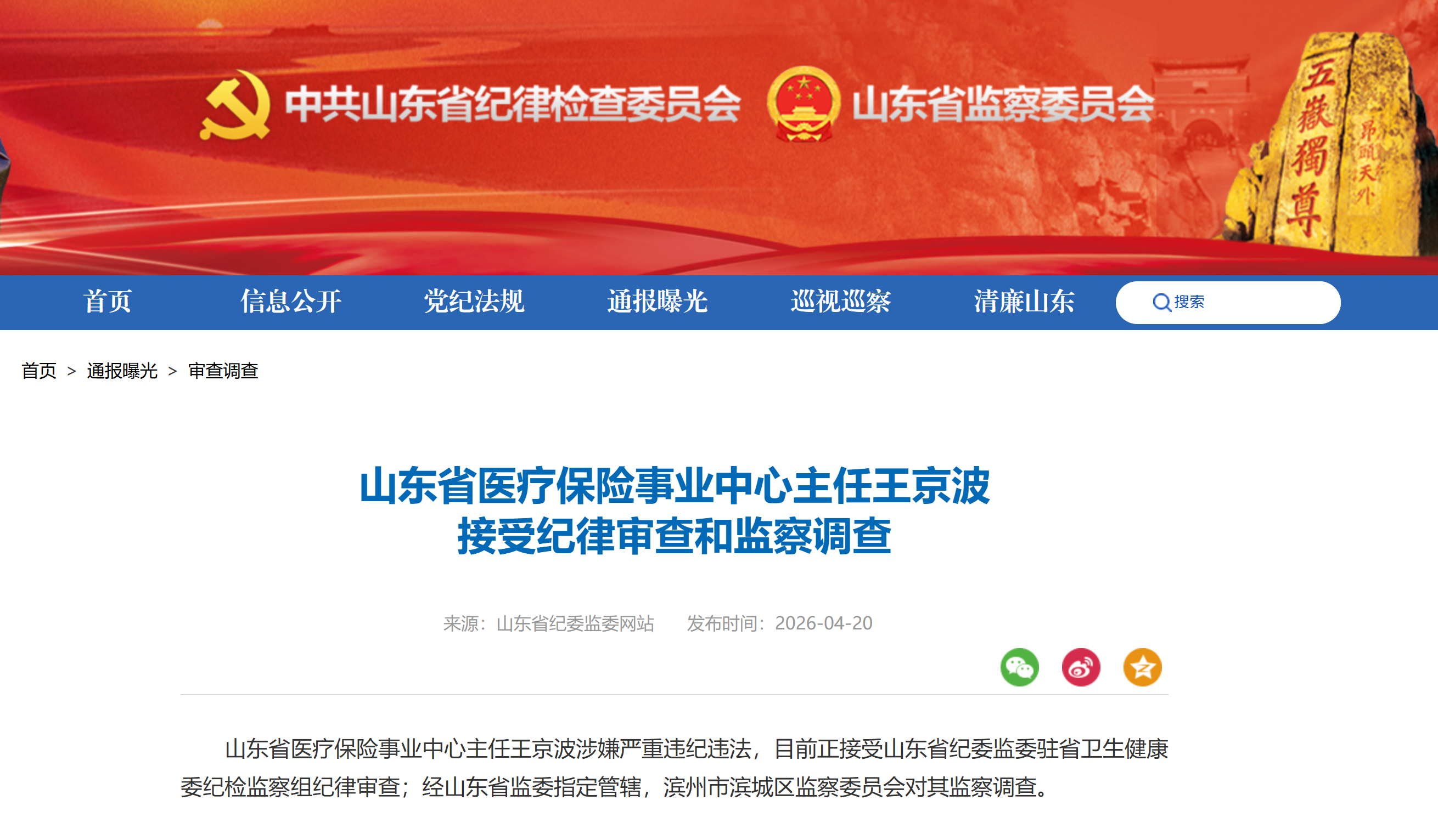 山东省纪委监委网站4月20日消息,山东省医疗保险事业中心主任王京波涉嫌严重违纪违法,目前正接受山东省纪委监委驻省卫生健康委纪检监察组纪律审查;经山东省监委指定管辖,滨州市滨城区监察委员会对其监察调查。